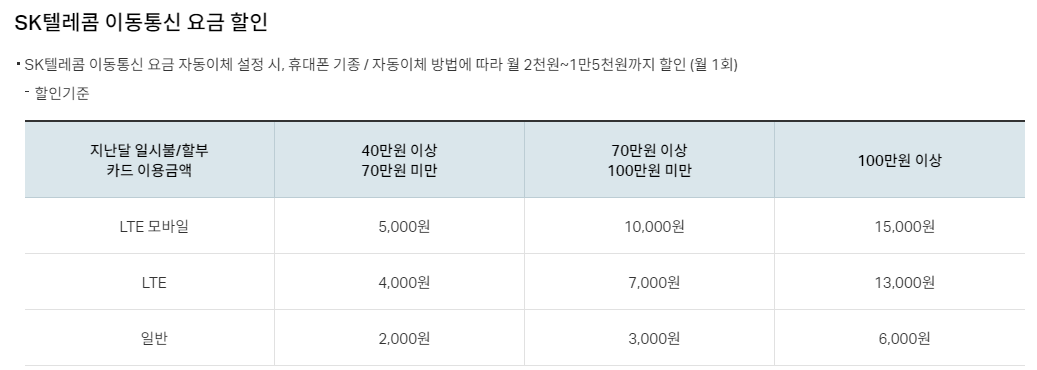 그래서 오랫동안 사용하고 있는 카드이기도 합니다. 모바일로 등록한것과 그냥 실물카드로만 사용하는 것에 할인 한도에 차이가 있습니다. 다른카드처럼 사용금액별 구간 할인도 다르구요. 종합적으로 사용하기 좋은 카드라,,,여러모로 사용하는데, 가족카드 발급 비용이 별도입니다. 그래서 전 실물카드는 아내에게 주고 사용하라고 하고, 전 모바일 카드로 사용합니다.